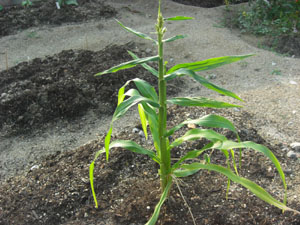 トウモロコシが大きくなってきて、先端に実?が出てきました。
